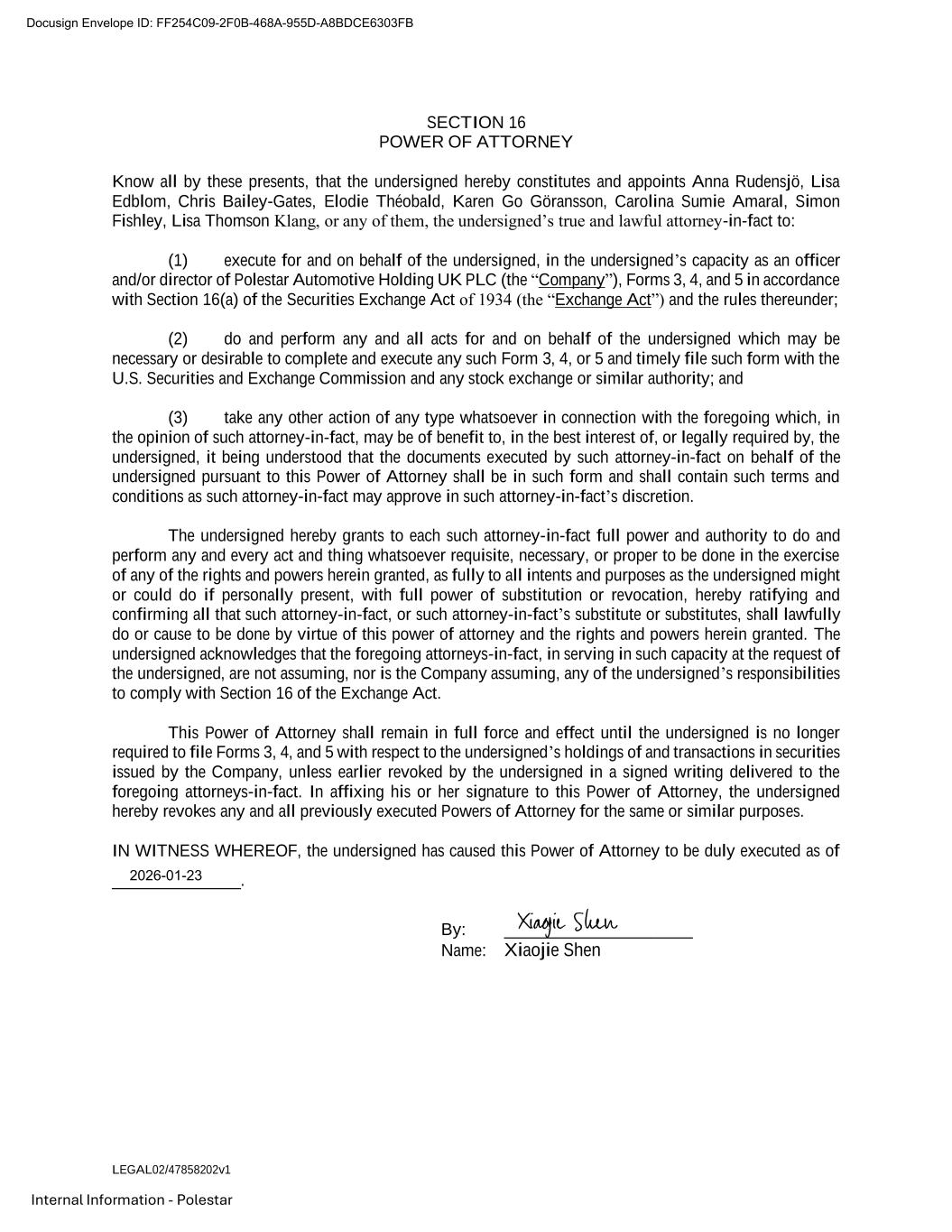 LEGAL02/47858202v1 Internal Information - Polestar SECTION 16 POWER OF ATTORNEY Know all by these presents, that the undersigned hereby constitutes and appoints Anna Rudensjö, Lisa Edblom, Chris Bailey-Gates, Elodie Théobald, Karen Go Göransson, Carolina Sumie Amaral, Simon Fishley, Lisa Thomson Klang, or any of them, the undersigned’s true and lawful attorney-in-fact to: (1) execute for and on behalf of the undersigned, in the undersigned’s capacity as an officer and/or director of Polestar Automotive Holding UK PLC (the “Company”), Forms 3, 4, and 5 in accordance with Section 16(a) of the Securities Exchange Act of 1934 (the “Exchange Act”) and the rules thereunder; (2) do and perform any and all acts for and on behalf of the undersigned which may be necessary or desirable to complete and execute any such Form 3, 4, or 5 and timely file such form with the U.S. Securities and Exchange Commission and any stock exchange or similar authority; and (3) take any other action of any type whatsoever in connection with the foregoing which, in the opinion of such attorney-in-fact, may be of benefit to, in the best interest of, or legally required by, the undersigned, it being understood that the documents executed by such attorney-in-fact on behalf of the undersigned pursuant to this Power of Attorney shall be in such form and shall contain such terms and conditions as such attorney-in-fact may approve in such attorney-in-fact’s discretion. The undersigned hereby grants to each such attorney-in-fact full power and authority to do and perform any and every act and thing whatsoever requisite, necessary, or proper to be done in the exercise of any of the rights and powers herein granted, as fully to all intents and purposes as the undersigned might or could do if personally present, with full power of substitution or revocation, hereby ratifying and confirming all that such attorney-in-fact, or such attorney-in-fact’s substitute or substitutes, shall lawfully do or cause to be done by virtue of this power of attorney and the rights and powers herein granted. The undersigned acknowledges that the foregoing attorneys-in-fact, in serving in such capacity at the request of the undersigned, are not assuming, nor is the Company assuming, any of the undersigned’s responsibilities to comply with Section 16 of the Exchange Act. This Power of Attorney shall remain in full force and effect until the undersigned is no longer required to file Forms 3, 4, and 5 with respect to the undersigned’s holdings of and transactions in securities issued by the Company, unless earlier revoked by the undersigned in a signed writing delivered to the foregoing attorneys-in-fact. In affixing his or her signature to this Power of Attorney, the undersigned hereby revokes any and all previously executed Powers of Attorney for the same or similar purposes. IN WITNESS WHEREOF, the undersigned has caused this Power of Attorney to be duly executed as of _______________. By: ______________________ Name: Xiaojie Shen Docusign Envelope ID: FF254C09-2F0B-468A-955D-A8BDCE6303FB 2026-01-23